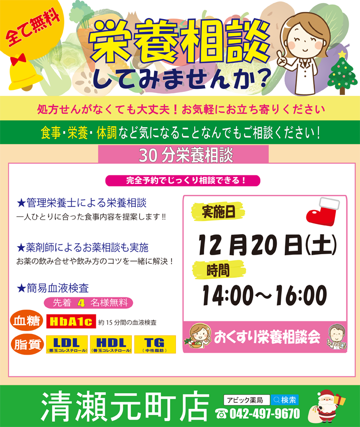 12月20日(土)アビック薬局清瀬元町店にて「おくすり栄養相談会」及び「指先から健康チェック無料体験会」を開催いたします。 (待ち時間なく落ち着いて相談していただけるよう予約制とさせていただいております。)「おくすり栄養相談会」では、アビックの薬剤師と管理栄養士がおくすりや栄養について1人30分枠での無料個別相談を実施しています。 「指先から健康チェック無料体験会」では、普段より地域の方にご利用いただいている簡易血液検査(「HbA1c」及び「脂質(LDLコレステロール・ HDLコレステロール・中性脂肪)」)を通常各500円のところ、先着4名様限定でHbA1c又は脂質のどちからお好きな検査を無料にて体験していただけます。 この機会に是非体験してください!!! ご予約は、アビック薬局清瀬元町店・清瀬の森店の店頭又はお電話にて受付中です! 定員に達し次第、締め切らせていただきますのでご了承ください。